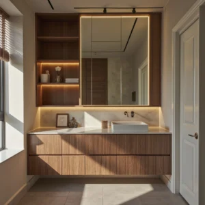 This combination balances cool and warm elements, making the bathroom feel cozy but not heavy. It suits rustic, Scandinavian, and even modern minimalist designs.