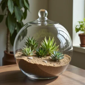 Pair this with neutral-toned pebbles or sphagnum moss at the base to retain moisture. The transparency of the glass dome makes this style perfect for modern or minimalist interiors, where it acts as a subtle but striking centerpiece. Remember to lift the dome occasionally to allow fresh air circulation and prevent mold.
