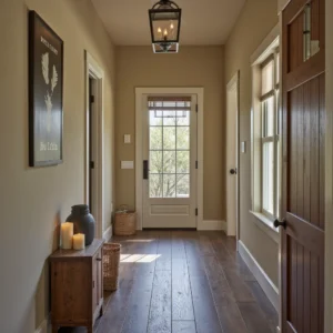 Lighting fixtures with a farmhouse feel—like metal lantern pendants or wood-accented chandeliers—add character and provide warm illumination.